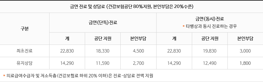 - 금연프로그램을 모두 이수한 경우, 1~2회에 본인이 부담한 비용의 100% 지급